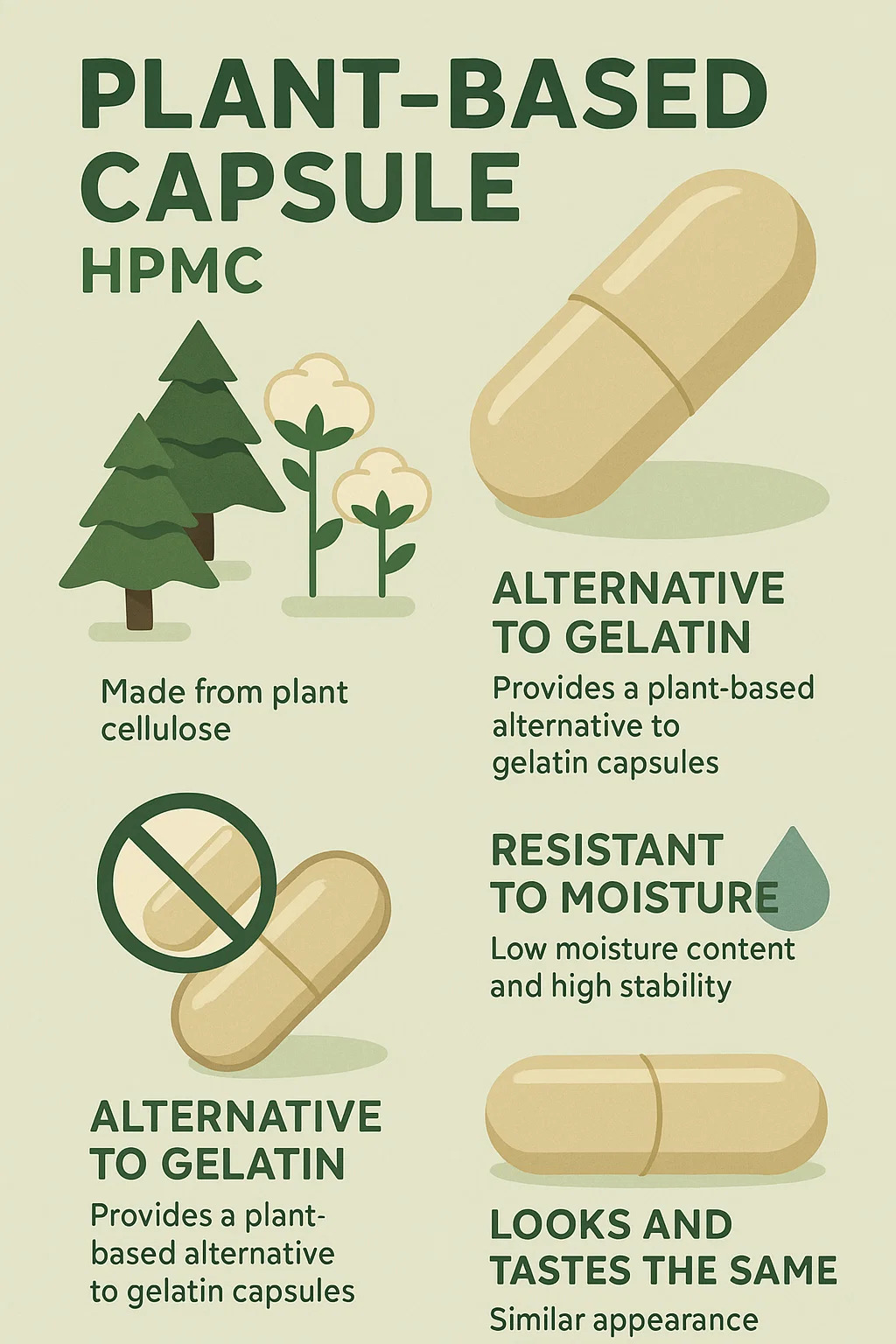 HPMC sounds like a complex chemical code, but it's actually what we commonly call a "plant-based capsule." If you are a vegetarian, or if you want to avoid animal products for religious or health reasons, this capsule perfectly meets your requirements.