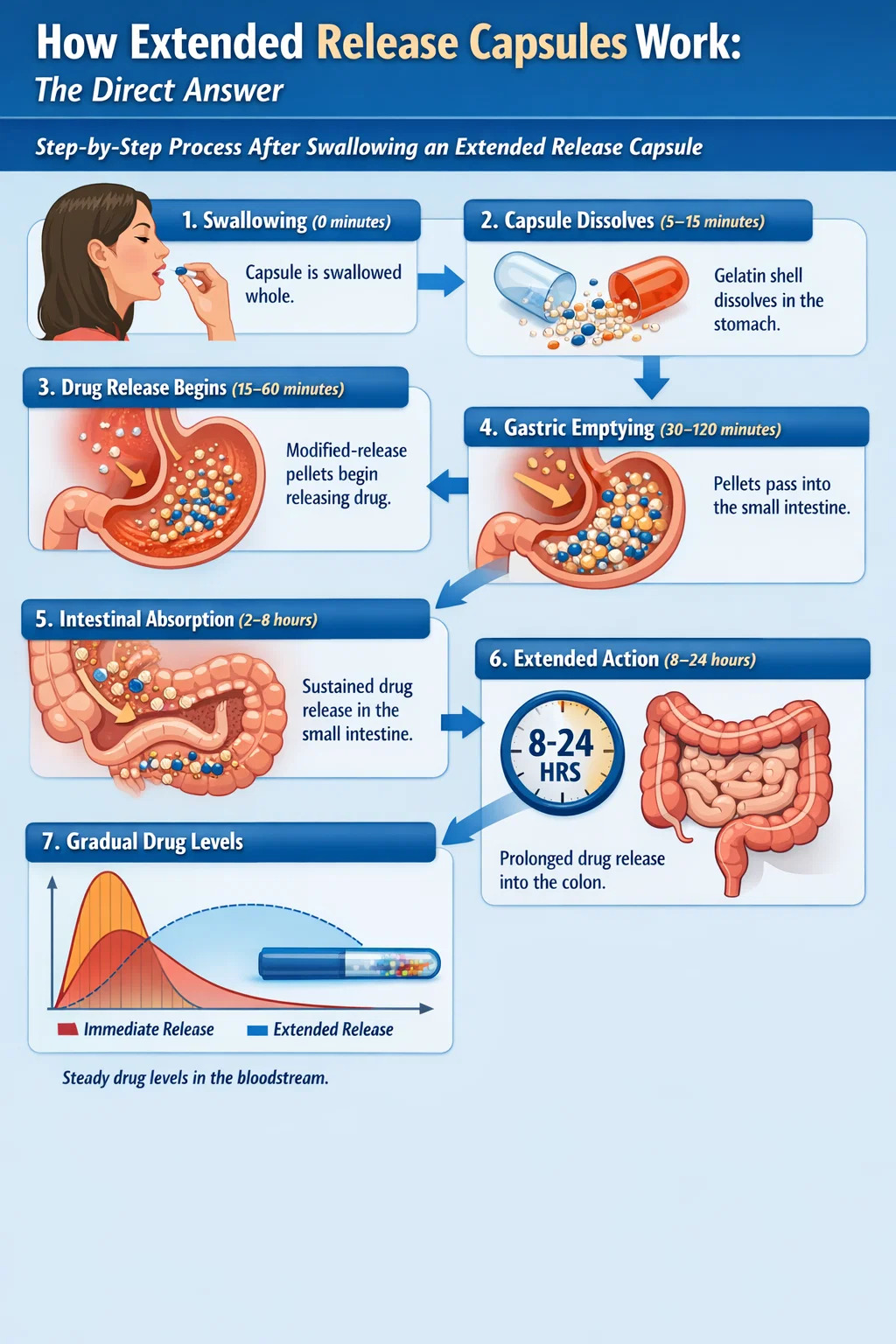 Walking through the physiological journey of an extended release gelatin capsule makes the mechanism easier to visualize: