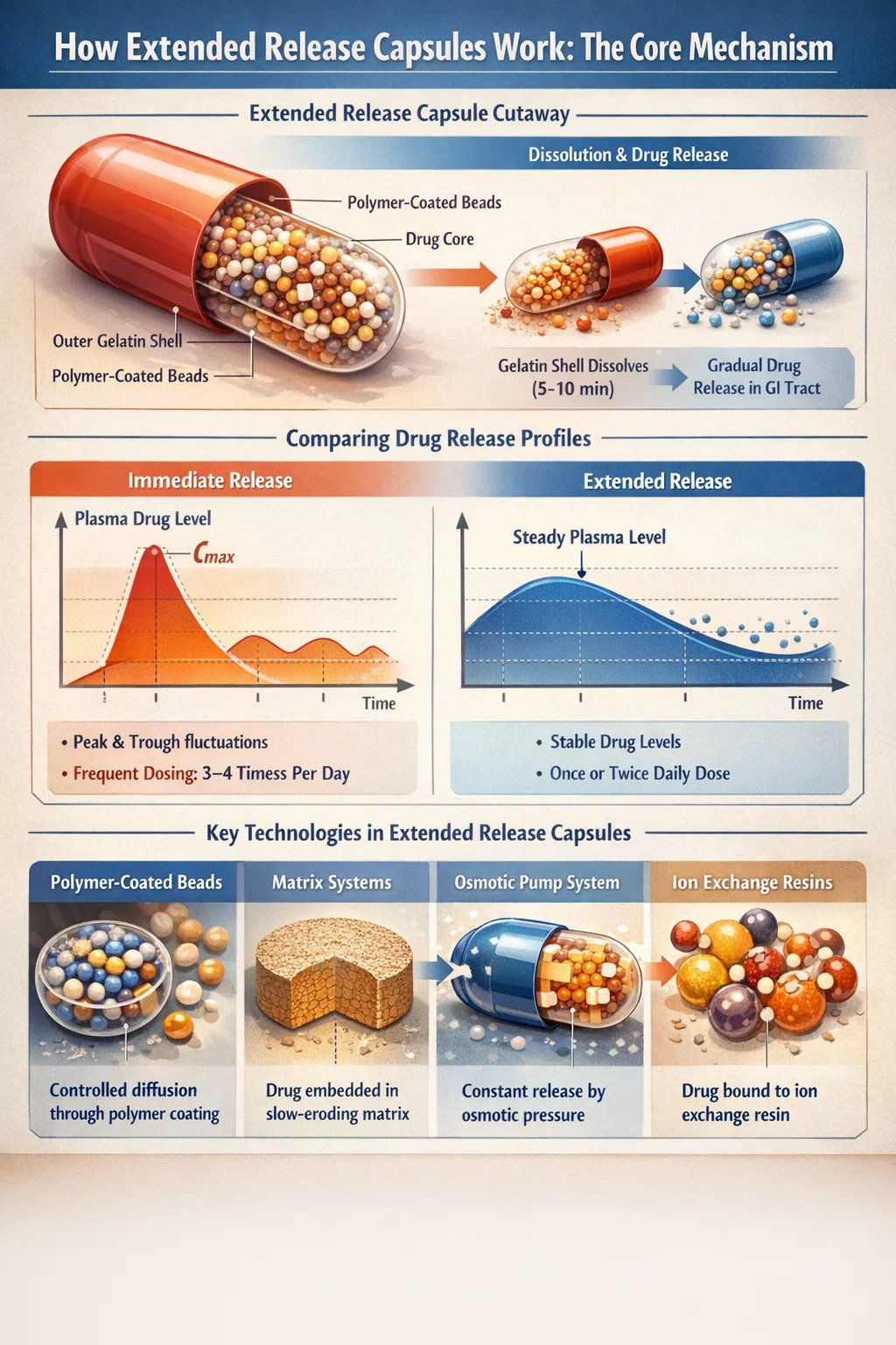 Unlike immediate release tablets that dissolve quickly in the stomach and deliver the full dose within 30 to 60 minutes, extended release capsules use physical and chemical barriers to slow that process. Depending on the design, a single capsule can maintain therapeutic drug levels for 12 or even 24 hours — replacing what might otherwise require three or four separate doses.