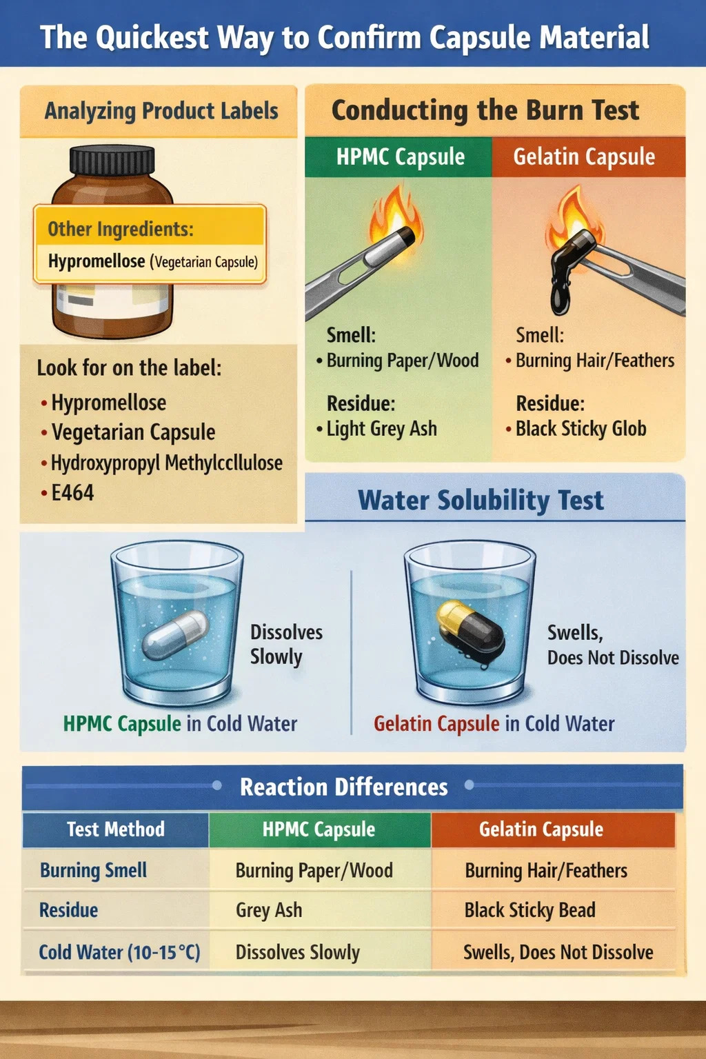 Visual inspection alone is rarely sufficient because modern manufacturing techniques have made HPMC capsules nearly indistinguishable from gelatin in terms of gloss and clarity. Therefore, checking the chemical behavior—specifically how it burns and how it dissolves—remains the only definitive way to identify the material without laboratory equipment.