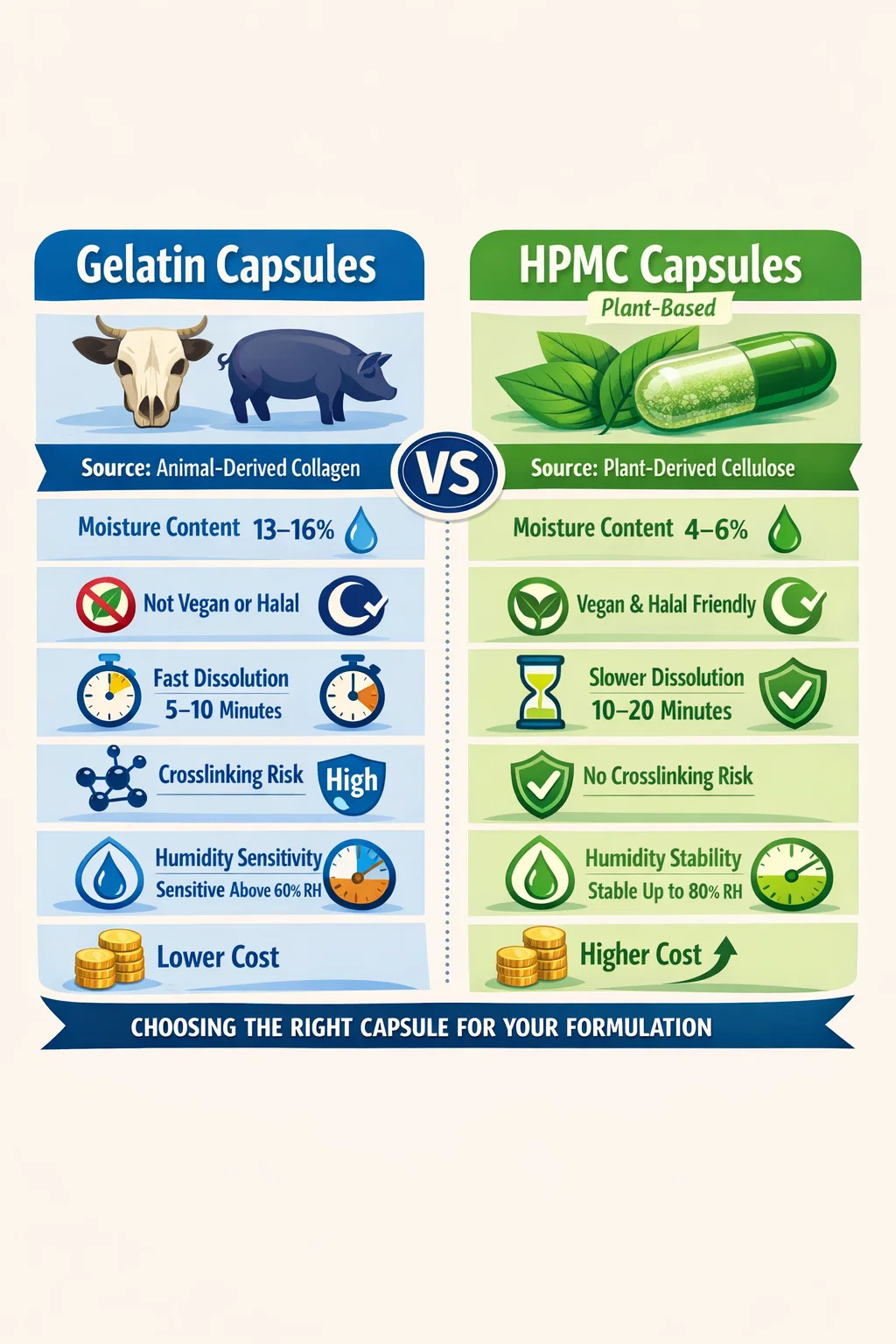 The core difference is simple: gelatin capsules are made from animal-derived collagen, while HPMC capsules (hydroxypropyl methylcellulose capsules) are plant-based. That single distinction cascades into meaningful differences in moisture content, dissolution behavior, stability under heat and humidity, compatibility with hygroscopic fills, and suitability for vegetarian, vegan, or halal markets. If you are choosing a capsule shell for a supplement or pharmaceutical product, the decision between these two types will affect your formulation, your shelf life, your target consumer, and your cost structure.