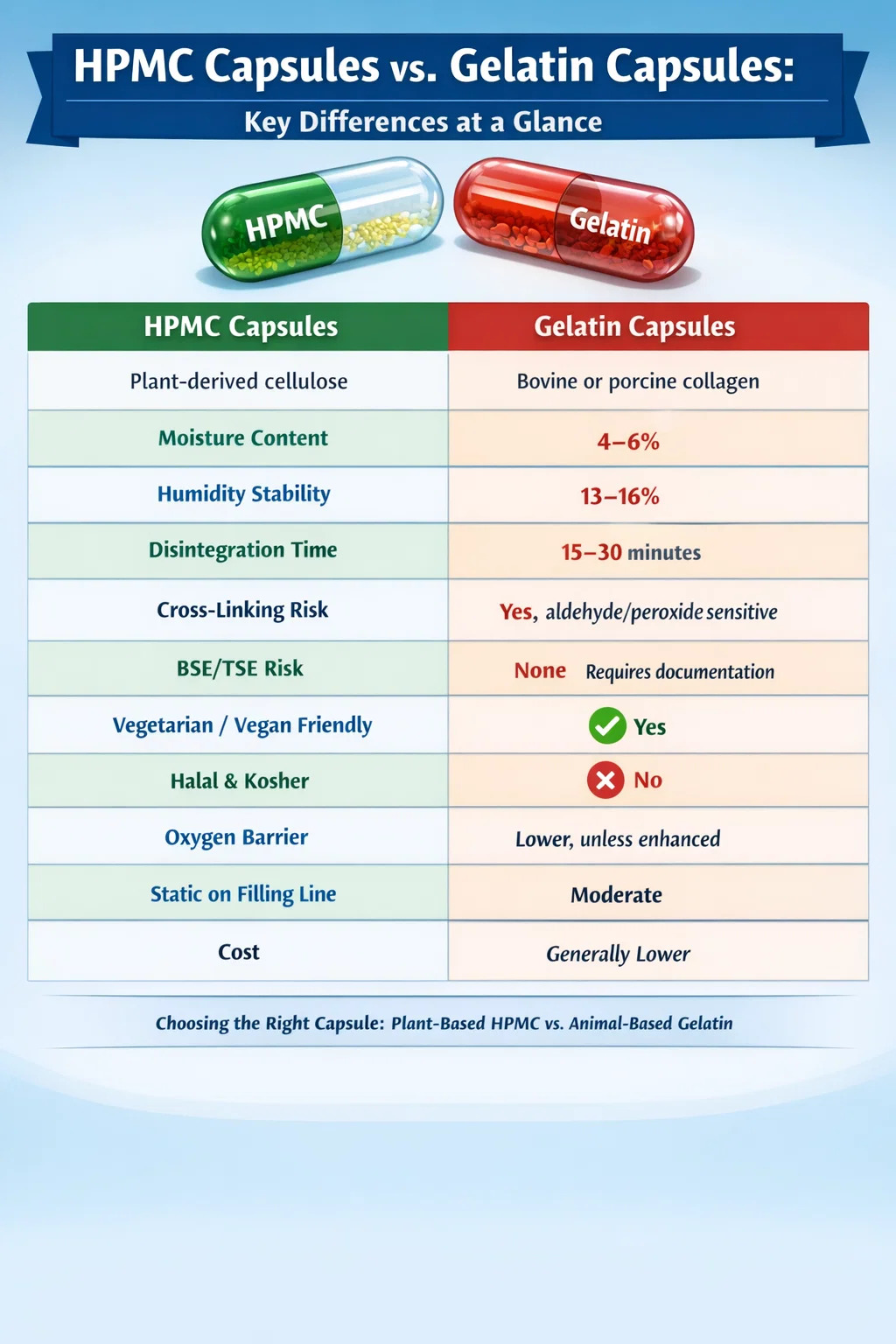 Gelatin capsules remain appropriate for cost-sensitive, high-volume applications with conventional fills where no dietary, religious, or compatibility constraints apply, and where rapid dissolution onset is a formulation priority. The two technologies are not in a simple hierarchy — they occupy different niches with genuine and legitimate differences in performance.